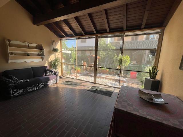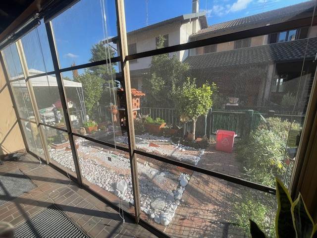 In zona molto tranquilla e ricercata bellissima villa a schiera pari al nuovo cosi disposta P. I.: ampio garage doppio e 2 locali (uno uso caldaia e l'altro uso lavanderia); P R.: ingresso, bellissimo soggiorno con importante cucina a vista, antibagno, bagno, per poi voler trovare momenti di relax una veranda/dependance esterna e completa il tutto un curato giardinetto; 2° P.: 3 camere da letto antibagno, bagno e balcone per completare il tutto con un piano sottotetto raggiungibile da scala e utilizzabile anche come locale hobby. Libera al rogito.
